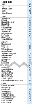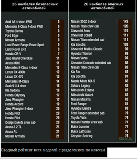 * Рейтинг включает в себя автомобили 2005-2008 модельного года, выпущенные для рынка США, поэтому они могут отличаться от европейских моделей характеристиками и комплектацией. Выделенное жирным шрифтом число после названия автомобиля – количество погибших в США водителей данной модели за 1 год в интервале с 2006 по 2009 г. в пересчете на 1 миллион автомобилей. Чем меньше это число, тем автомобиль безопаснее.