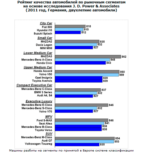 Международное маркетинговое агентство J. D. Power & Associates совместно с немецким потребительским журналом Auto Test опубликовало результаты последнего рейтинга удовлетворенности автовладельцев. Масштабное исследование, проводившееся в Германии с января по март 2011 года, охватило 17 150 владельцев двухлетних легковых автомобилей. С каждым из них было проведено подробное интервью, включавшее 67 вопросов. Они были разделены на четыре группы: общее впечатление от автомобиля (дизайн, комфортабельность, динамика и т. п.); качество сборки, надежность, количество поломок; стоимость владения (включая бензин, ТО, ремонт); качество работы дилеров и сервисных центров марки.