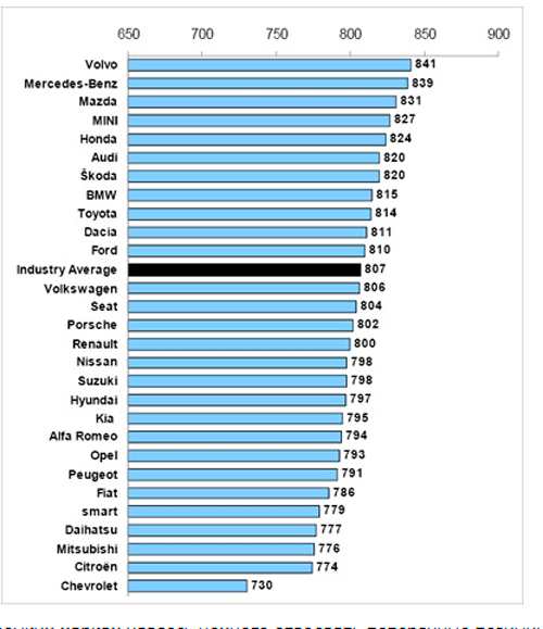 Эти результаты были обработаны и сведены в таблицы двух типов – по маркам и по классам автомобилей. В список марок не вошли те, которые представлены на рынке Германии ограниченно, – Saab, Lancia, Dodge, ряд подобных им и, к слову, российская Lada, хотя анкетеры опрашивали и владельцев экспортных ВАЗов. Из 28 оставшихся в рейтинге марок лидером стала шведская Volvo – она набрала 841 балл из 1000 возможных. На второй строчке оказался немецкий Mercedes-Benz, но кроме него в топ-5 «немцев» больше не оказалось: в пятерку вошли японские Mazda и Honda и британский MINI. Audi, BMW, Volkswagen и Porsche заняли шестое, восьмое, двенадцатое и четырнадцатое места, причем последние два – даже ниже среднего по индустрии показателя.