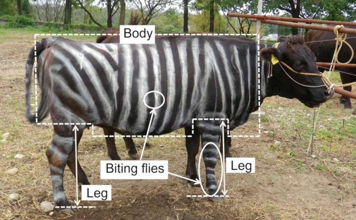 - Біологія: за дослідження, можуть корови, розфарбовані смугами, як у зебри, уникнути укусів мух. Японські вчені довели, що, якщо корову розфарбувати чорно-білими смужками, як зебру, її на 50% менше кусатимуть мухи, гедзі й інші комахи.