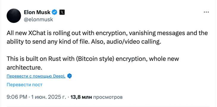 Американський мільярдер Ілон Маск анонсував запуск XChat - месенджера на платформі соцмережі X, який, за його словами, використовує "шифрування в стилі біткоїну" (Bitcoin style encryption).
