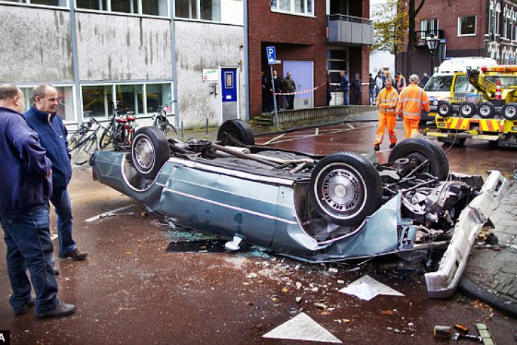 В минувшую пятницу в городе Лейдене в провинции Южная Голландия произошла странная авария, сообщает английское издание Daily Mail. Там автомобиль, протаранив кирпичную стену, вылетел с третьего этажа стоянки и приземлился «вверх ногами». Водитель был госпитализирован с тяжелыми травмами, а машина поле падения полностью разбита. Полагают, что 44-летний мужчина за рулем не справился с управлением, когда пытался выехать с автостоянки. К счастью, в аварии больше никто не пострадал.