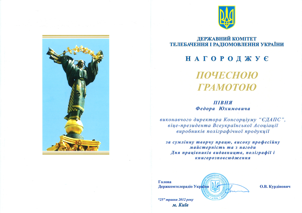 Почетной грамотой Государственного Комитета телевидения и радиовещания Украины за добросовестный труд и высокое профессиональное мастерство награжден исполнительный директор консорциума «ЕДАПС», вице-президент Всеукраинской Ассоциации производителей полиграфической продукции Федор Пивень.