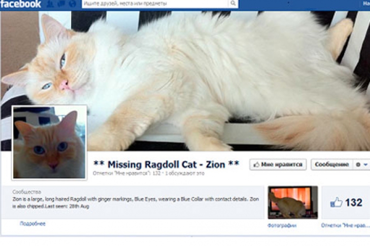 Через три дня отчаявшийся хозяин создал страницу в Facebook с красноречивым названием «Пропавший кот-регдолл - Зион» и попросил друзей из своего контакт-листа рассказать о странице в своих аккаунтах, рассказывают СМИ. В разделе «Информация» Вудли подробно описал приметы потерявшегося животного, а также указал, что на кошачьем ошейнике есть данные о его владельце.