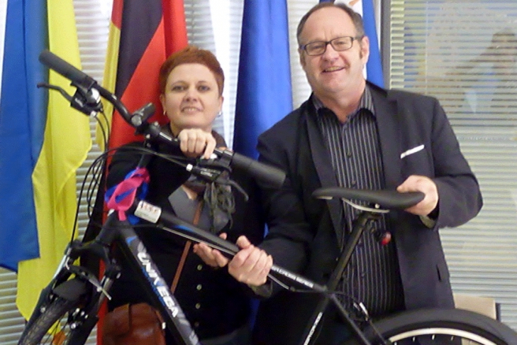Представители Немецкого общества международного сотрудничества (GIZ) вручили Оксане Фесык новенький городской велосипед. Она стала победительницей радиоконкурса, который состоялся 22 сентября по случаю Всемирного дня без автомобилей. Ее имя было выбрано во время жеребьевки среди других финалистов, в течение недели правильно отвечавших на вопросы из сферы устойчивой мобильности. В воскресенье завершилась Европейская Неделя Мобильности (ЕНМ). В этом году количество городов и общин, присоединившихся к этому движению, значительно возросло. Конкурс проводился совместно Ассоциацией велосипедистов Киева, радиостанцией Retro FM и Немецким обществом международного сотрудничества (GIZ) в рамках проведения ЕНМ в Киеве. Главной целью конкурса было повышение осведомленности людей об альтернативных видах передвижения и популяризация велосипеда как дружественного к окружающей среде транспортного средства.
