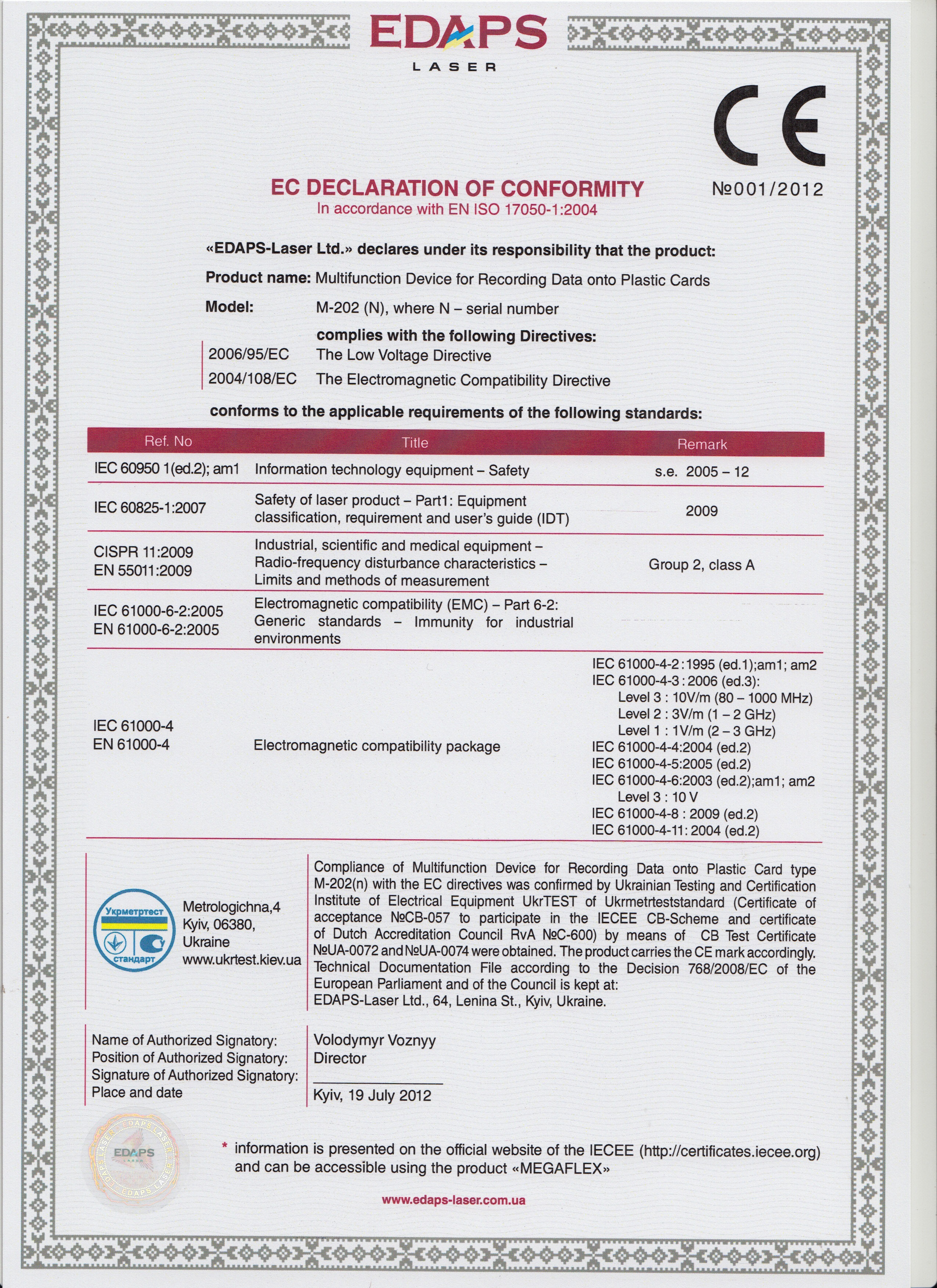 Первым документом, защищенным новейшей украинской разработкой - технологичной платформой MegaFlex – стала Декларация соответствия требованиям директив и гармонизированных стандартов Европейского Союза. Этот документ выдан на оборудование производства «ЕДАПС» консорциума для персонализации идентификационных документов. Об этом информационному агентству «Наш Продукт» сообщили в пресс-службе «ЕДАПС» консорциума.