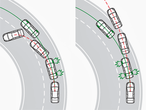 Этот рисунок наглядно иллюстрирует ситуацию, когда водитель превысил максимальную скорость вхождения в поворот, и начался занос (или снос). Красная линия — это траектория движения машины без ESP. Если её водитель начнёт тормозить, у него есть серьёзный шанс развернуться, а если нет — то улететь с дороги. ESP же выборочно подтормозит нужные колёса так, чтобы автомобиль остался на нужной траектории.