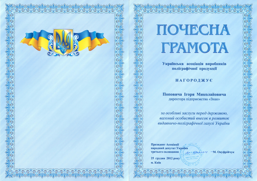 Руководитель предприятия (является участником EDAPS.com) Игорь Попович получил почетную грамоту этой организации