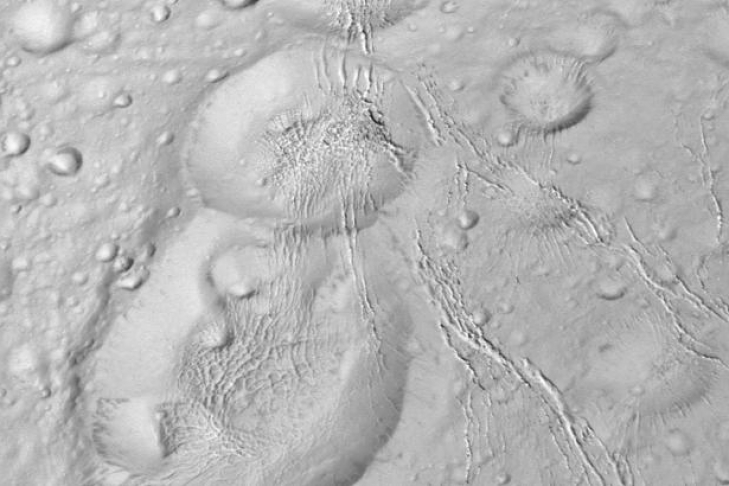 На изображениях заметны три кратера, которые пересекают многочисленные трещины
