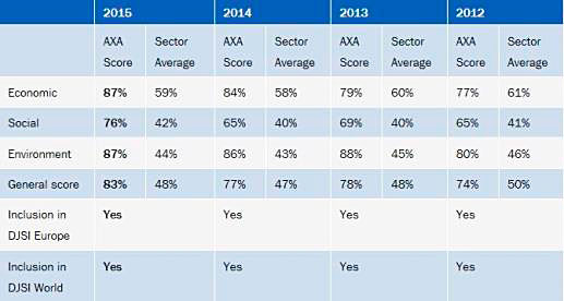RobecoSAM наградил АХА "Бронзовым классом" рейтинга Устойчивости компаний 2016*, опубликованном в ежегодном отчете агентства. Согласно оценке RobecoSAM и индексу устойчивости Доу-Джонса (Dow Jones Sustainability Index, S&P Dow Jones Indices) АХА повысила свой общий балл с 77 до 83/100. Оценка AXA улучшилась во всех трех областях анкеты RobecoSAM (экономические, экологические и социальные аспекты). Высокая оценка выдвинула Группу АХА вперед, позволив обойти 96 % компаний-представителей данной индустрии, а также значительно превысить средний показатель сектора, который составляет 48/100. Наиболее значительный рывок компании удалось сделать благодаря своей прозрачной налоговой политике.