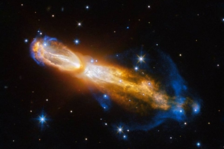 Запечатленная на фотографии туманность OH 231.8+04.2, или "Тухлое яйцо" — пример того, как звезда, в данном случае красный гигант, превращается в планетарную туманность. При этом внешние слои звезды, состоящие из газов и пыли, выбрасываются в окружающее пространство. Выброшенное вещество движется с огромной скоростью: например, скорость газов, которые на фотографии показаны желтым, достигает приблизительно миллиона километров в час.