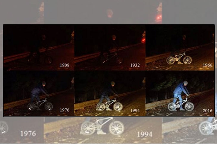 Ряд світлин демонструє, як змінювалось вид на дорогу з автомобілів, починаючи з Ford Model T 1908 р. і закінчуючи Ford Mustang, і підкреслює значний прогрес у розвитку технологій освітлення. Велосипедист знаходиться на відстані всього 12 метрів попереду автомобіля із включеними фарами.