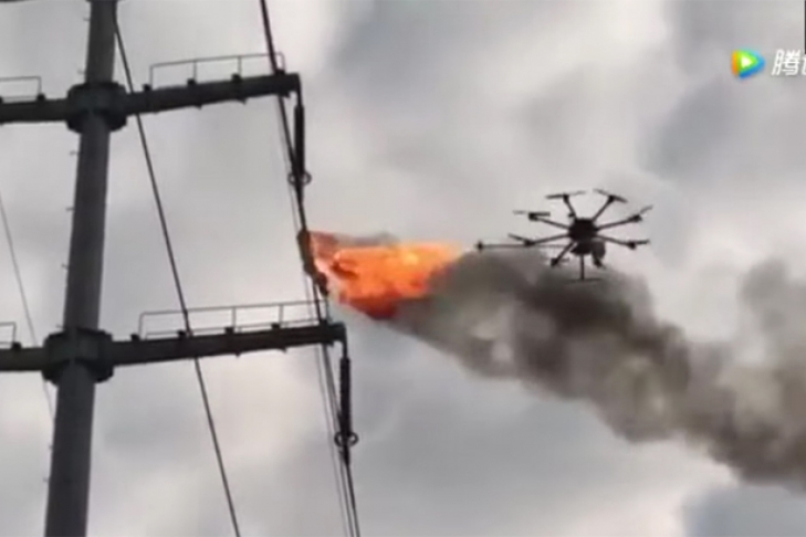 В Китае дрон с огнеметом удаляет мусор с ЛЭП (видео)