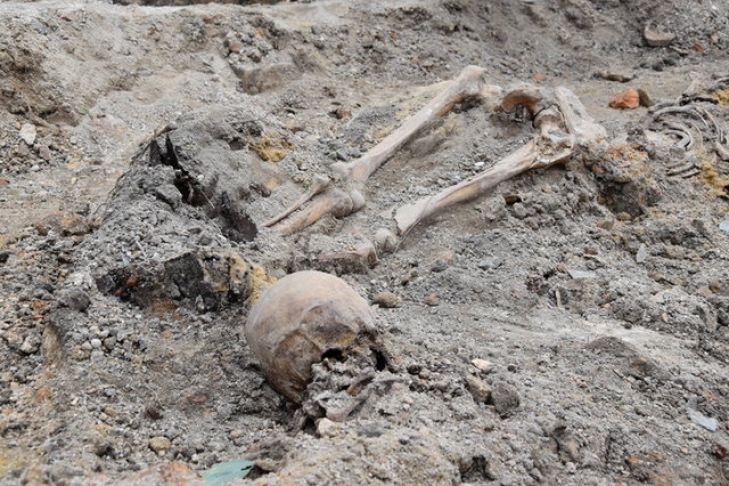 По мнению специалистов, на месте раскопок была воронка от взрыва снаряда, поэтому человеческие тела бросили в яму и засыпали землей.