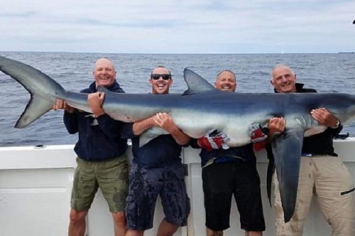 На фото четыре рыбака запечатлены с улыбками на лице, ведь они поймали самую большую голубую акулу в Великобритании.