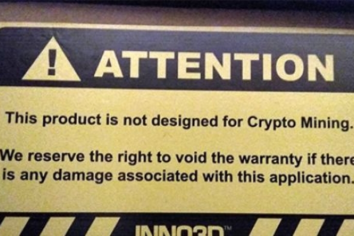 Наклейка предупреждает, что указанный продукт не предназначен для добычи криптовалют. Поэтому Inno3D оставляет за собой право снимать с себя все гарантийные обязательства в том случае, если видеокарта выйдет из строя в процессе майнинга.