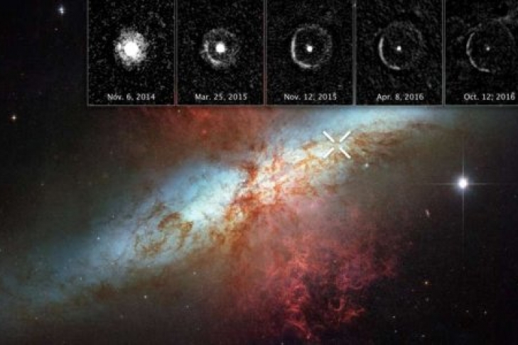 Серия маленьких снимков, наложенных на снимок галактики M82, демонстрирует нам расширяющуюся сферу света и отраженный свет, называемый "световым эхом". Первый из снимков был сделан спустя 10 месяцев после момента взрыва сверхновой, а последний - через два года (с 6 ноября 2014 до 12 октября 2016). Свет от взрыва отражается в произвольных направлениях от гигантского облака, размер которого составляет от 300 до 1600 световых лет, что позволило астрономам зафиксировать этот процесс при помощи телескопа, сообщает dailytechinfo.org.