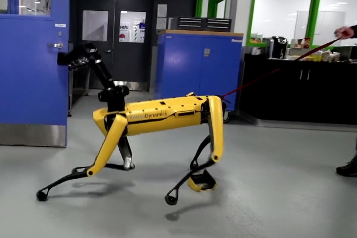 В ролике, который Boston Dynamics выложила неделю назад, было показано сотрудничество двух машин — SpotMini без манипулятора не могу пройти через дверь, и второй такой же робот, но оснащенный змееподобной "рукой", помогал ему.