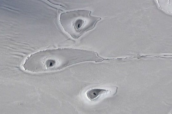 При съемке Арктики с воздуха специалисты NASA обнаружили странные круглые отверстия во льду. Их происхождение пока что не установлено. О находке сообщается на сайте NASA.