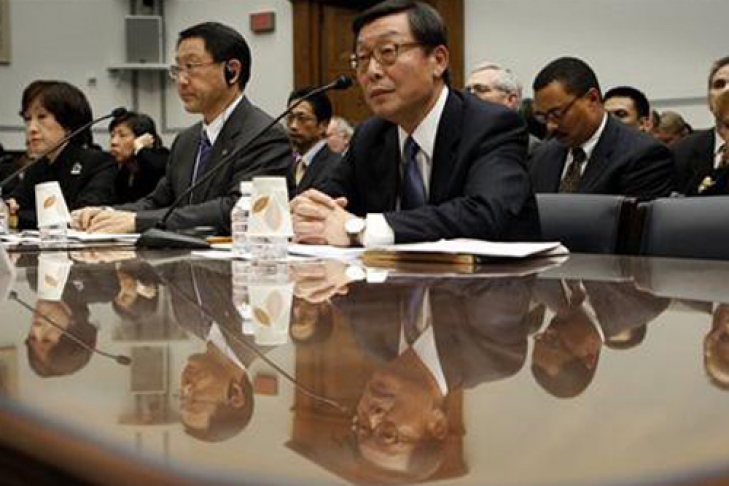 Общаясь через переводчика, Тойода ответил на вопросы членов Палаты представителей США о том, как руководство «Тойоты» узнало о проблемах в системе безопасности и как оно отреагировало на них. Первоначально, в 2007 году компания заявила, что проблема связана с ковриком для пола, но затем сообщила, что виной всему – застревающая педаль газа. Сейчас считается, что корень проблемы – в электротехнической неисправности управляемого компьютером акселератора.