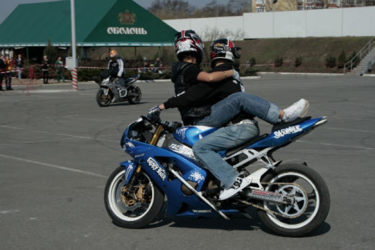 Итак, первыми, кто потешил зрителей, стали байк-экстремалы, которые на специальной площадке перед выставочным залом проделывали различные цирковые номера. Они и показали технику езды на мотоцикле без рук, сидя сбоку и даже лежа на своем байке. Без проблем «сдавали» стометровку на заднем колесе, а также их мотоцикл без проблем ставал «на дыбы», при этом имея в своем седле сразу двух наездников.