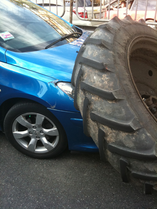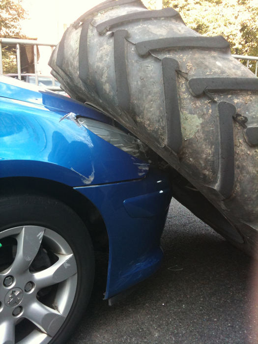 В Киеве огромное колесо от трактора пыталось раздавить легковую «Пежо» (ФОТО)