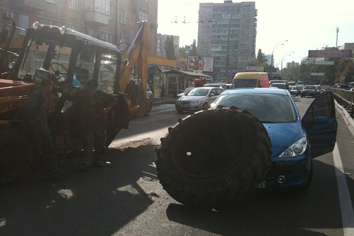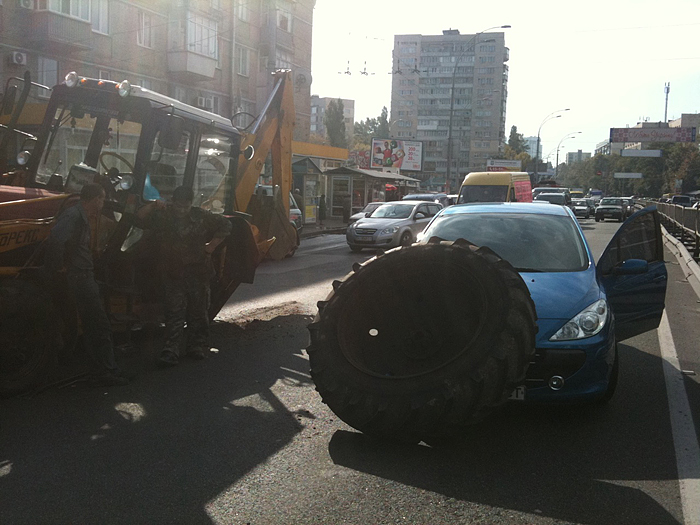 Сегодня около девяти утра синий «Пежо», который мирно ехал по проспекту Комарова в Киеве, атаковало… тракторное колесо. Да не простое, а огромное. Вероятней всего, оно просто отвалилось от трактора и упало на капот проезжавшего мимо автомобиля.