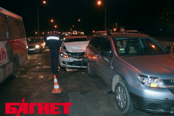 На эстакаде, что возле рынка «Юность», Mazda 6 на полном ходу протаранила внедорожник Mitsubishi, который, в свою очередь, оказался в задней части Volkswagen.