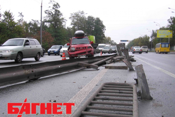 Двигаясь в затяжном повороте по бульвару Перова в сторону проспекта Освободителей, джип «Сузуки», потеряв управление, врезался в отбойник - такого удара отбойник не выдержал. Пробив металлическое ограждение джип вылетел на полосу встречного движения развернувшись на 180 градусов. Как выяснилось, у авто лопнуло переднее колесо.