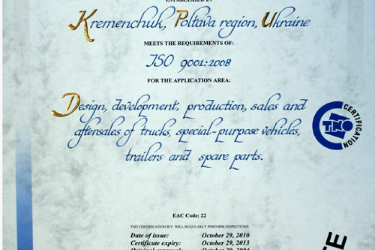 Сертификат был выдан на основании положительных результатов ресертификационной аудиторской проверки системы управления качеством Холдинговой Компании «АвтоКрАЗ», которая проводилась ведущими международными экспертами–аудиторами компанией «Citech Ukraine B.V» – официальным представителем нидерландской организации TNO CERTIFICATION B.V. в Украине.