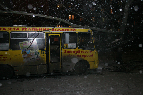 Водитель автобуса «Богдан», двигавшегося по маршруту № 45 решил объехать пробку на ул. Строителей. В результате он выехал на улицу Пожарского. Внезапно автобус потерял управление. Маршрутку занесло прямиком в дерево. Поскольку движение по этой улице интенсивным назвать никак нельзя, выпавший снег успешно скрыл толстый слой льда на дороге. По словам жителей окрестных домов, лед образовался в результате прорыва канализации еще две недели назад.
