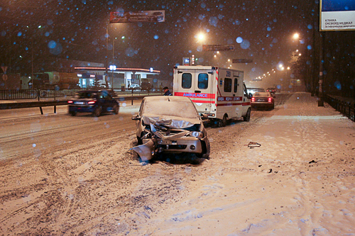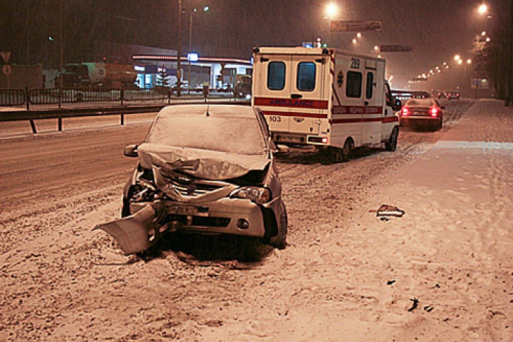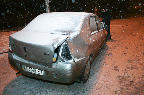 По словам водителя Dacia Logan, он двигался в левом ряду бульвара Перова в направлении Троещины. При попытке опередить грузовик, ехавший правее, иномарка получила касательный удар в правое заднее крыло, после чего потеряла управление, вылетела на тротуар и, срикошетив от столба, вернулась на дорогу. Водитель грузовика почел за благо не останавливаться и с места происшествия скрылся. Водитель же иномарки отделался шоком и от госпитализации отказался. Logan восстановлению не подлежит.
