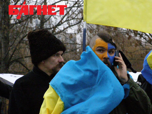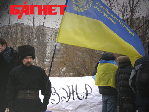 И почетный караул возле информационного баннера «ЗУНР + УНР = Соборна Україна!»