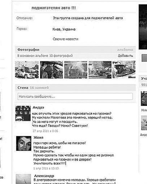 «Не доказано, что именно эти пользователи и являются поджигателями автомобилей – они просто обсуждают эту тему и в действительности они вряд ли понесут ответственность: на любую тему в блогах идет обсуждение. Например, кто-то кого-то за горло в Верховной раде схватил и кто-то пишет, что «надо этих депутатов вообще поубивать». Естественно за такие вещи должна быть ответственность», - сообщил нам начальник Центра по связям с общественностью ГУ МВД Украины в г. Киеве Владимир Полищук.