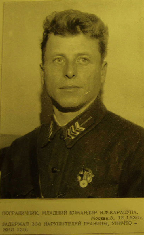 Есть в музее, хоть и небольшая, экспозиция, посвященная нашему герою. В которой и указано, что в пограничных войсках Никита Карацупа с 1932 года. Свою службу начал на Дальнем Востоке на заставе «Полтавка» Гродековского погранотряда. Окончил школу младшего начальствующего состава служебного собаководства пограничной охраны, курсы начальствующего состава при Центральной школе служебного собаководства пограничных войск НКВД.