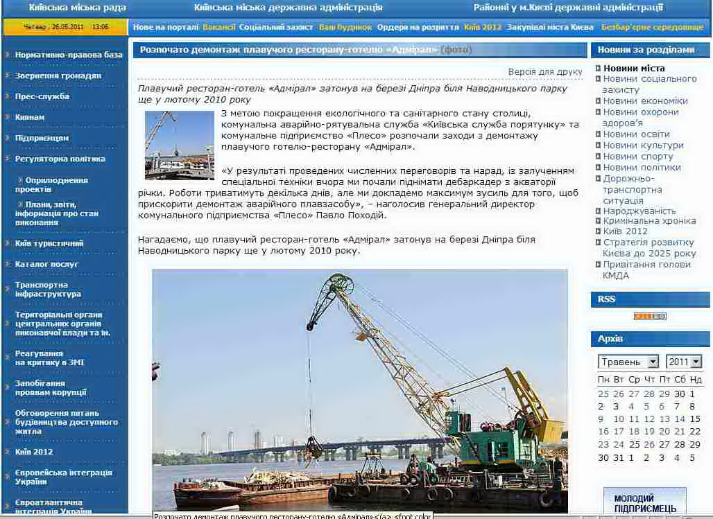 Давыденко напомнил, что 25 мая 2011 на официальном веб-портале КГГА появилось сообщение о демонтаже дебаркадера «Адмирал», который затонул еще в феврале 2010 года в акватории Днепра возле Наводницкого парка.