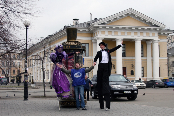 Скучать зрителям возле памятника Григорию Сковороде на Контрактовой площади не давали и актёры театра на ходулях.