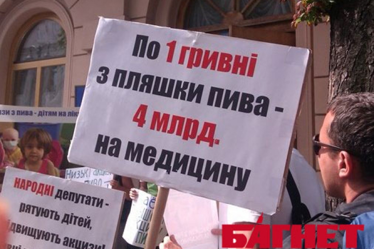 В понедельник, 1 июля, под стенами здания комитетов Верховной Рады Украины состоялась акция протеста против игнорирования депутатами законопроектов по поднятию акцизов на пиво. Эти средства предлагается направить на строительство больницы для детей.