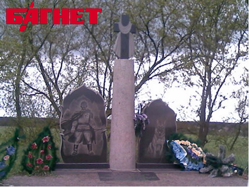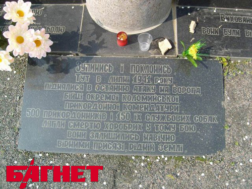 «Остановись и поклонись. Тут в июле 1941 года поднялись в последнюю атаку на врага бойцы отдельной Коломийской пограничной комендатуры. 500 пограничников и 150 их служебных собак полегли смертью храбрых в том бою. Они остались навсегда верными присяге, родной земле».