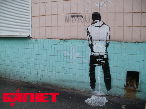 9. На девятом месте в рейтинге «Багнета» рисунок, который получил в народе неформальное название «Писающий мальчик». Композиция вошла в наш рейтинг благодаря креативной задумке авторов – привлечение внимания горожан и городских властей к проблемам стихийных туалетов в Киеве. Лицезреть сей рисунок можно во дворе дома №59 по просп. Победы.