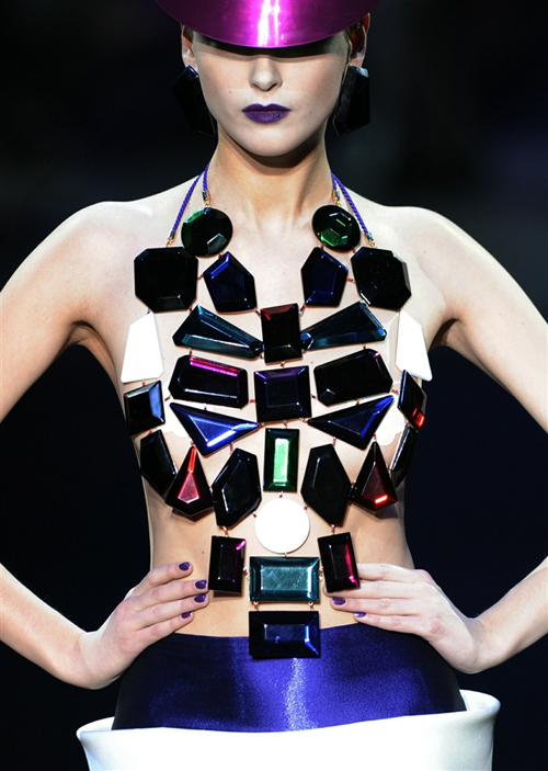 Модель в творении от «On Aura Tout Vu» на показе коллекции весна-лето 2011 на Неделе высокой моды в Париже 26 января