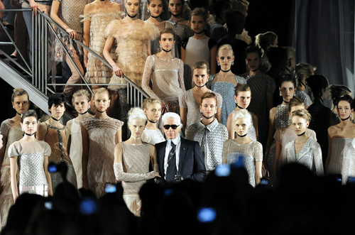 Дизайнер Карл Лагерфелд после показа коллекции весна-лето 2011 в Париже