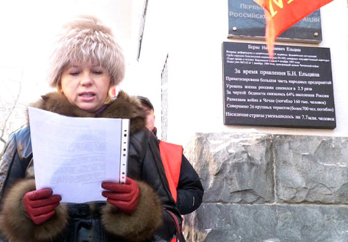 После кратких выступлений представителей КПРФ и СКМ на фасад здания была установлена мемориальная доска размером 60х80 см. Инсталляция была выполнена из лёгкого пенопласта, обклеенного «под гранит». Поэтому она легко держалась на двустороннем скотче, не принося никакого ущерба зданию. На доске были перечислены основные «достижения» первого Президента России на этом посту. После установки, сразу несколько сотрудников милиции-полиции стали звонить начальству и зачитывать весь текст с доски. Вероятно высшие чины правоохранителей так и не нашли к чему придраться, потому что в акцию они так и не вмешались.