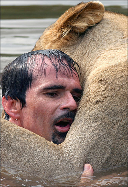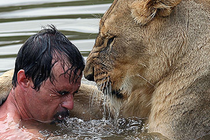 Кевин Ричардсон (Kevin Richardson) играет, спит и даже плавает с животными. Он зоолог, изучающий поведение животных. Не так давно Кевин отважился плавать и нырять с огромной львицей.
