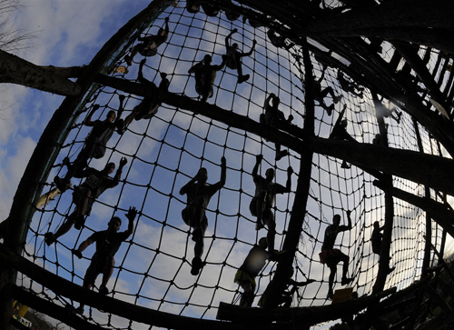 Участники Tough Guy Challenge 2011 преодолевают одно из более двадцати препятствий гонки - пробираются по веревочной сетке, установленной на 15-метровой высоте.