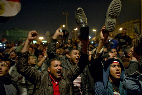 Египетские антиправительственные демонстранты размахивают обувью в знак протеста против речи президента, который отказался уходить в отставку. (Pedro UgarteAFP/Getty Images)