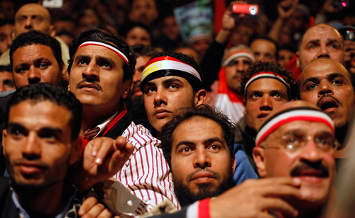 Выкрикивая лозунги, демонстранты были в приподнятом настроении перед обращением Мубарака к народу. Слухи и новости, ходившие весь день, намекали на то, что президент (для многих молодых демонстрантов – единственный, которого они знали) уйдет в отставку.