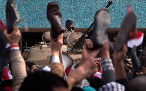 Солдат в танке в окружении демонстрантов, поднявших обувь в знак протеста, перед большим экраном на здании в центре Каира. (Emilio Morenatti/Associated Press)