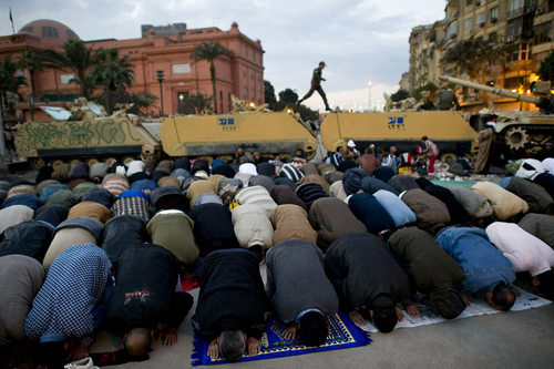 Демонстранты во время вечерней молитвы перед военной техникой на площади Тахрир. (Pedro Ugarte/AFP/Getty Images)