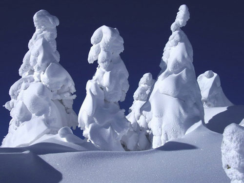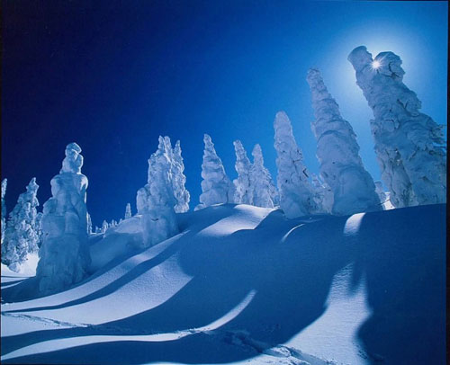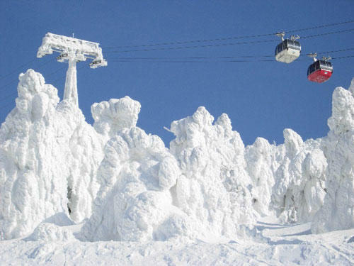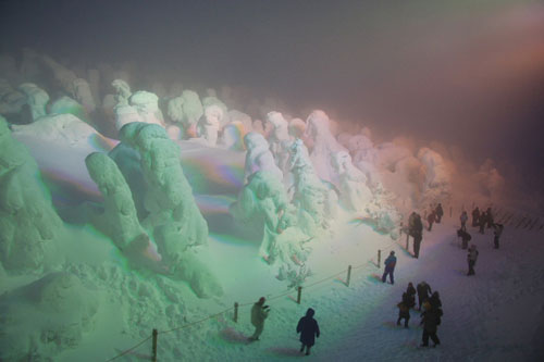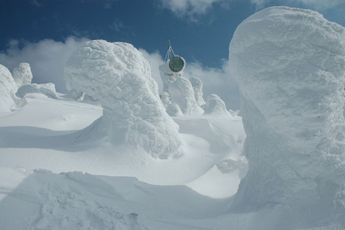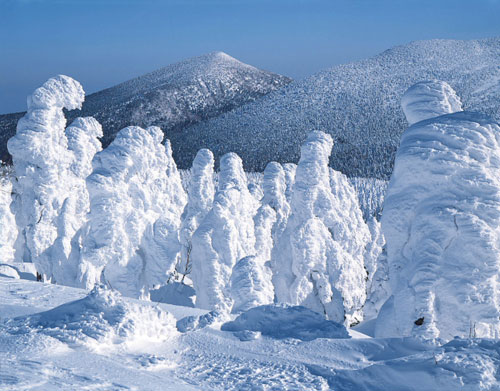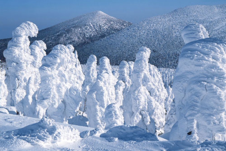 Вот что значит настоящее налипание мокрого снега! Это удивительное явление часто наблюдается в Японии. Снег в огромных количествах налипает на деревья и получаются вот такие «скульптуры». Обозвали их снежными монстрами.